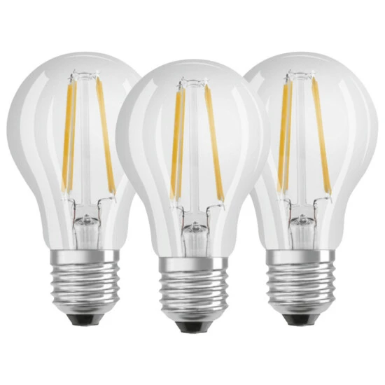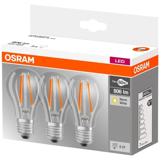 - Lieferumfang: 1x Glühlampe klar Osram Base A60 7W/827 E27 3er Box LED Filament